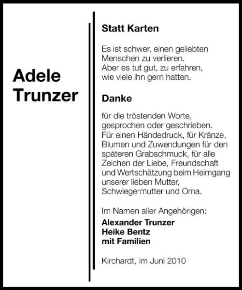 Hier finden Sie alle Traueranzeigen aus der Zeitung, die bisher für Adele Trunzer erschienen sind. Weitere Traueranzeigen, die in der Zeitung erscheinen, werden hier ebenfalls aufgelistet