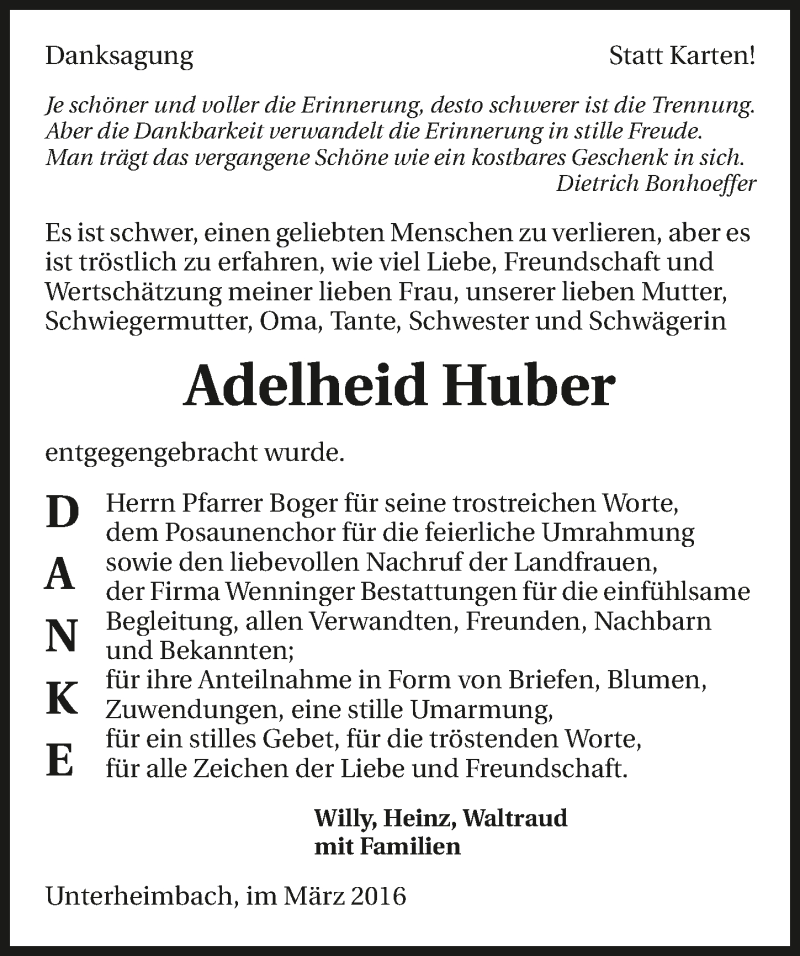 Hier finden Sie alle Traueranzeigen aus der Zeitung, die bisher für Adelheid Huber erschienen sind. Weitere Traueranzeigen, die in der Zeitung erscheinen, werden hier ebenfalls aufgelistet