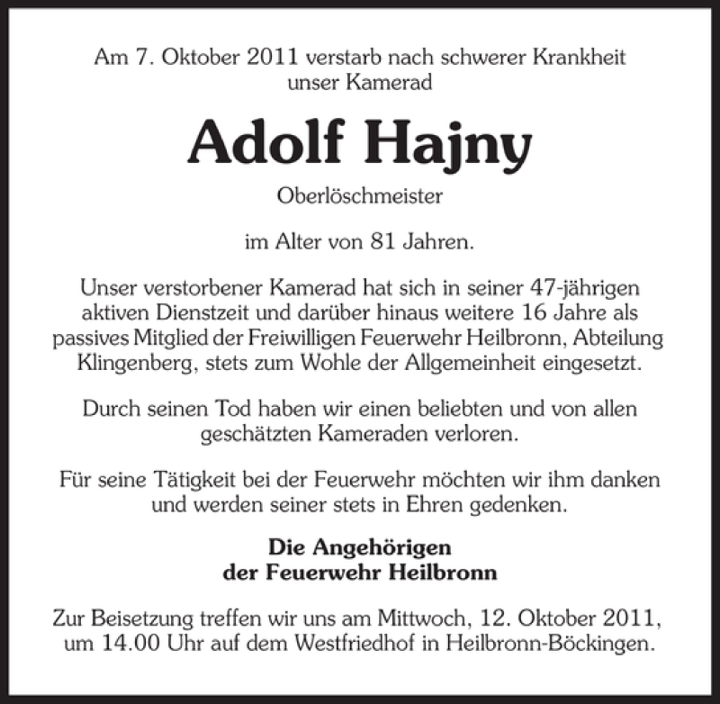 Hier finden Sie alle Traueranzeigen aus der Zeitung, die bisher für Adolf Hajny erschienen sind. Weitere Traueranzeigen, die in der Zeitung erscheinen, werden hier ebenfalls aufgelistet
