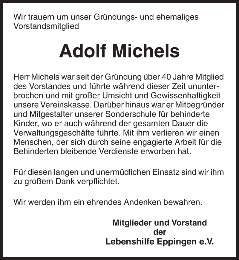 Hier finden Sie alle Traueranzeigen aus der Zeitung, die bisher für Adolf Michels erschienen sind. Weitere Traueranzeigen, die in der Zeitung erscheinen, werden hier ebenfalls aufgelistet