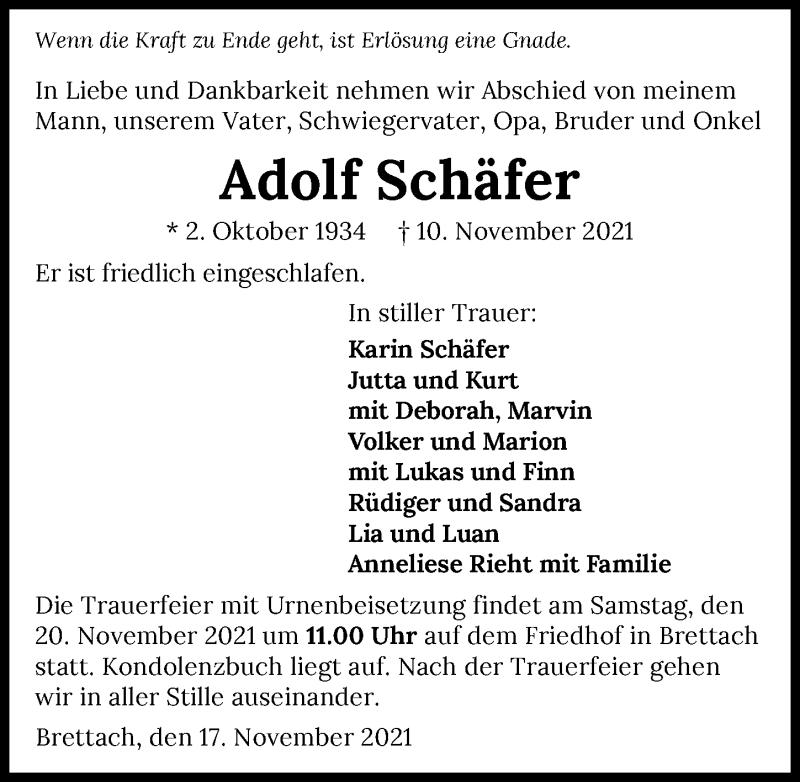 Hier finden Sie alle Traueranzeigen aus der Zeitung, die bisher für Adolf Schäfer erschienen sind. Weitere Traueranzeigen, die in der Zeitung erscheinen, werden hier ebenfalls aufgelistet
