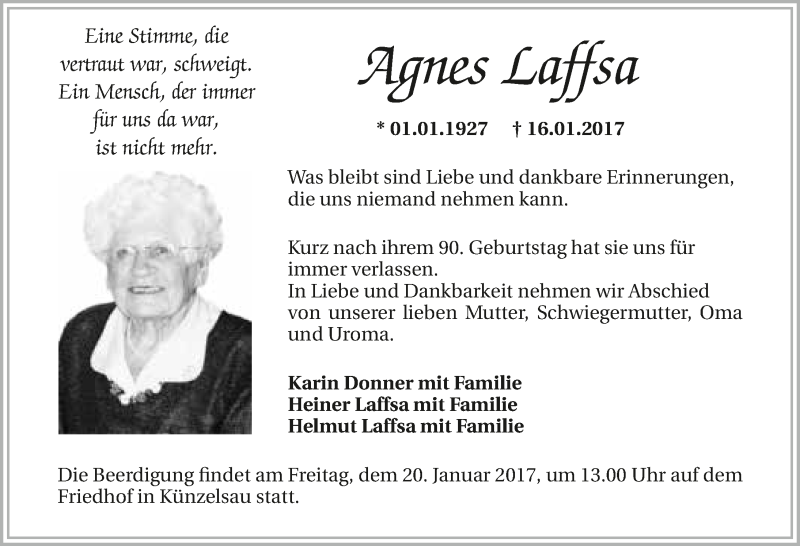 Hier finden Sie alle Traueranzeigen aus der Zeitung, die bisher für Agnes Laffsa erschienen sind. Weitere Traueranzeigen, die in der Zeitung erscheinen, werden hier ebenfalls aufgelistet