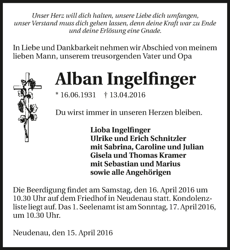 Hier finden Sie alle Traueranzeigen aus der Zeitung, die bisher für Alban Ingelfinger erschienen sind. Weitere Traueranzeigen, die in der Zeitung erscheinen, werden hier ebenfalls aufgelistet