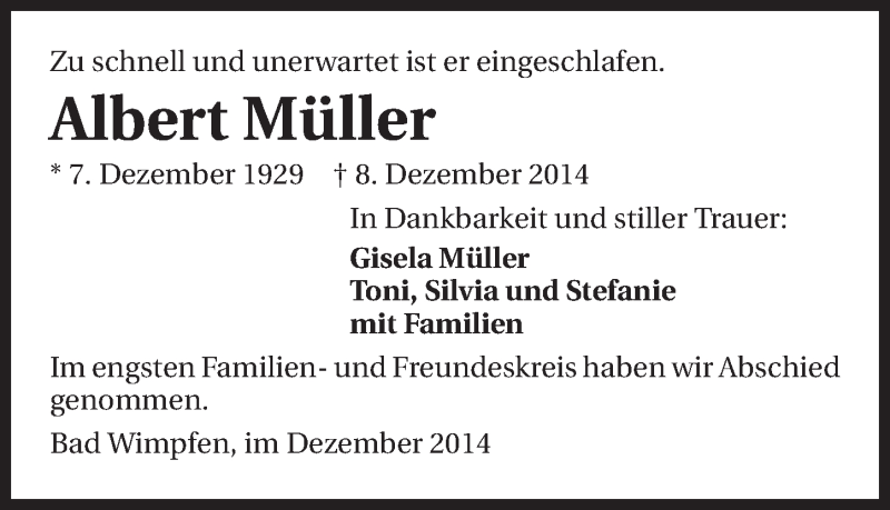 Hier finden Sie alle Traueranzeigen aus der Zeitung, die bisher für Albert Müller erschienen sind. Weitere Traueranzeigen, die in der Zeitung erscheinen, werden hier ebenfalls aufgelistet