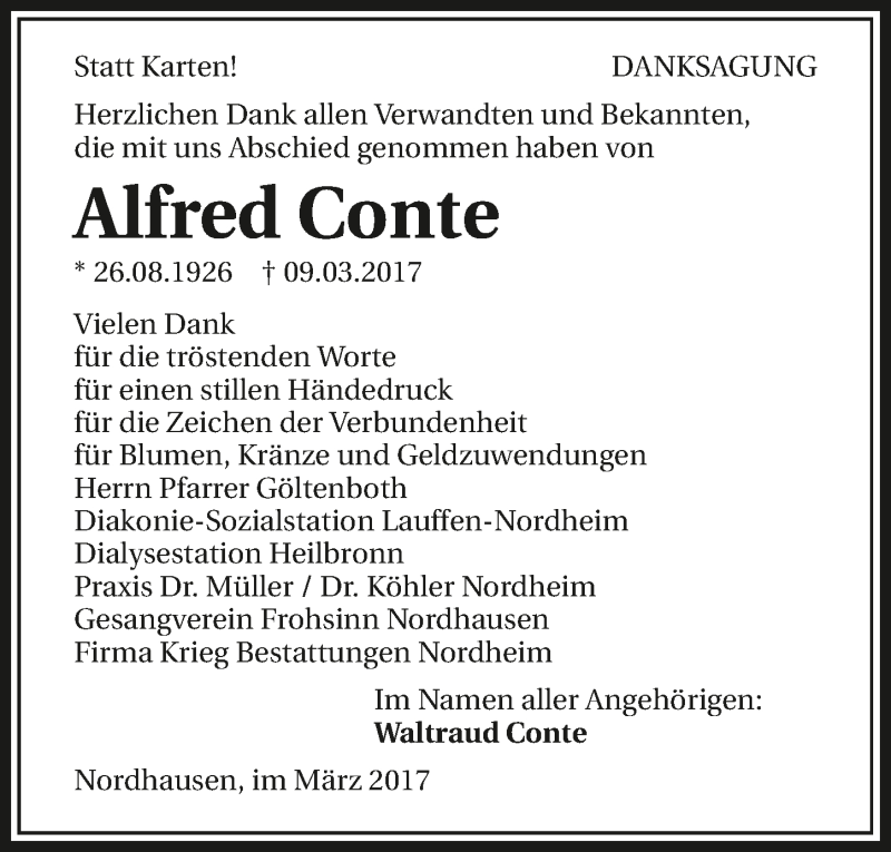 Hier finden Sie alle Traueranzeigen aus der Zeitung, die bisher für Alfred Conte erschienen sind. Weitere Traueranzeigen, die in der Zeitung erscheinen, werden hier ebenfalls aufgelistet