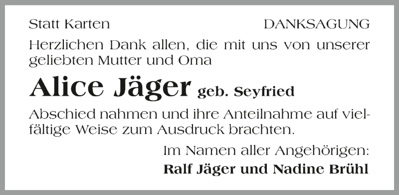 Hier finden Sie alle Traueranzeigen aus der Zeitung, die bisher für Alice Jäger erschienen sind. Weitere Traueranzeigen, die in der Zeitung erscheinen, werden hier ebenfalls aufgelistet