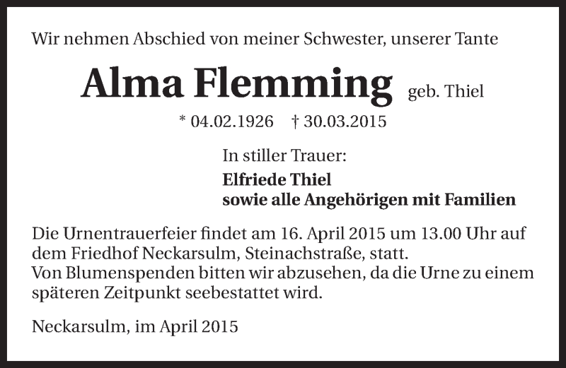 Hier finden Sie alle Traueranzeigen aus der Zeitung, die bisher für Alma Flemming erschienen sind. Weitere Traueranzeigen, die in der Zeitung erscheinen, werden hier ebenfalls aufgelistet