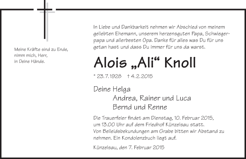 Hier finden Sie alle Traueranzeigen aus der Zeitung, die bisher für Alois Knoll erschienen sind. Weitere Traueranzeigen, die in der Zeitung erscheinen, werden hier ebenfalls aufgelistet