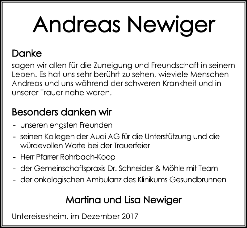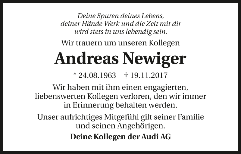 Hier finden Sie alle Traueranzeigen aus der Zeitung, die bisher für Andreas Newiger erschienen sind. Weitere Traueranzeigen, die in der Zeitung erscheinen, werden hier ebenfalls aufgelistet