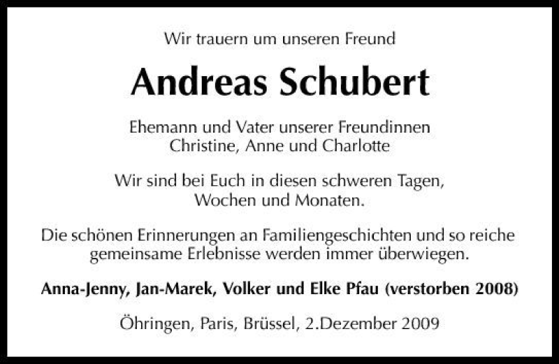 Hier finden Sie alle Traueranzeigen aus der Zeitung, die bisher für Andreas Schubert erschienen sind. Weitere Traueranzeigen, die in der Zeitung erscheinen, werden hier ebenfalls aufgelistet
