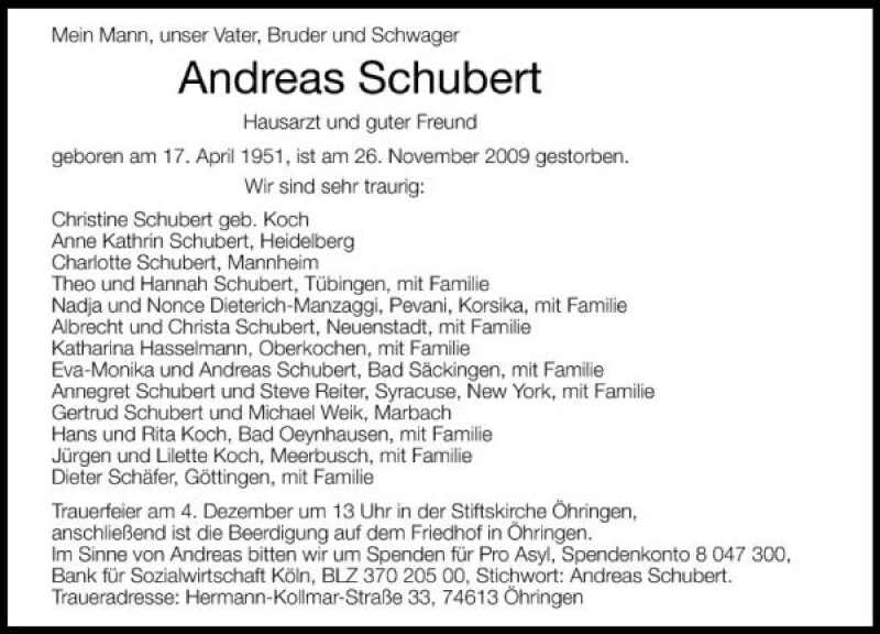 Hier finden Sie alle Traueranzeigen aus der Zeitung, die bisher für Andreas Schubert erschienen sind. Weitere Traueranzeigen, die in der Zeitung erscheinen, werden hier ebenfalls aufgelistet