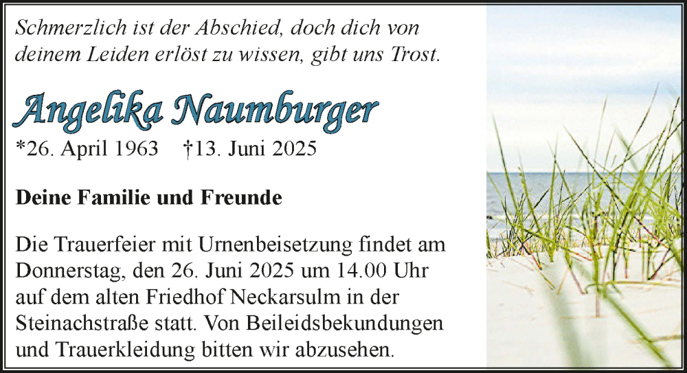 Hier finden Sie alle Traueranzeigen aus der Zeitung, die bisher für Angelika Naumburger erschienen sind. Weitere Traueranzeigen, die in der Zeitung erscheinen, werden hier ebenfalls aufgelistet
