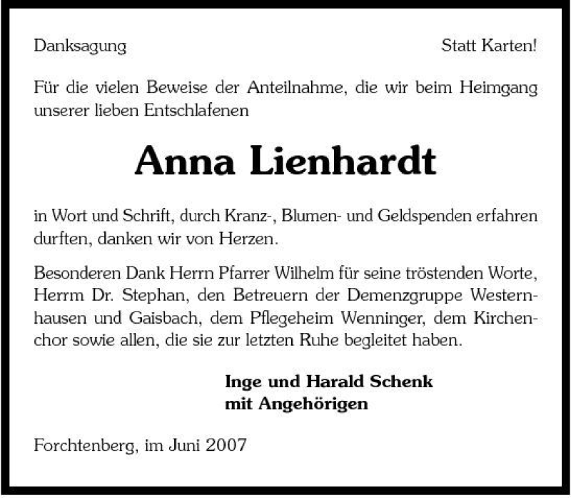 Hier finden Sie alle Traueranzeigen aus der Zeitung, die bisher für Anna Lienhardt erschienen sind. Weitere Traueranzeigen, die in der Zeitung erscheinen, werden hier ebenfalls aufgelistet