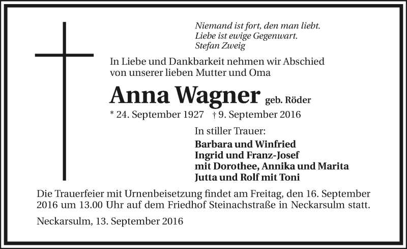 Hier finden Sie alle Traueranzeigen aus der Zeitung, die bisher für Anna Wagner erschienen sind. Weitere Traueranzeigen, die in der Zeitung erscheinen, werden hier ebenfalls aufgelistet