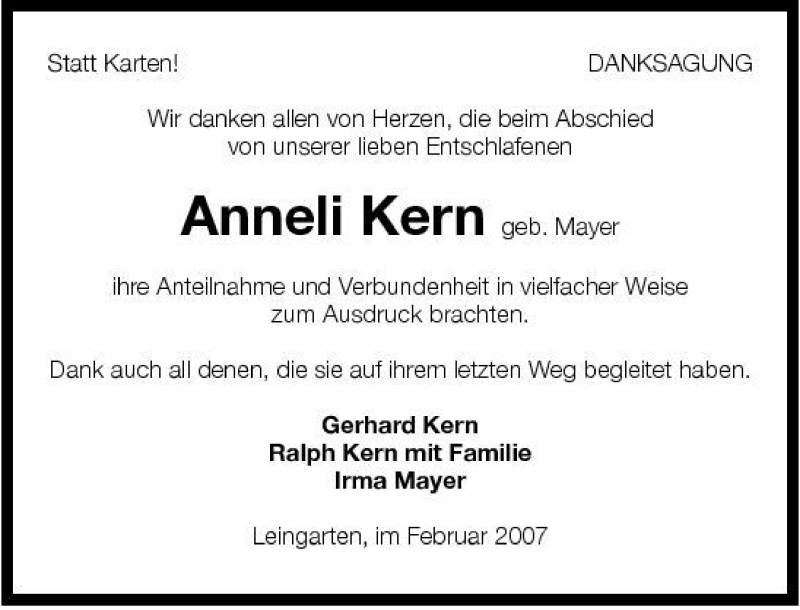 Hier finden Sie alle Traueranzeigen aus der Zeitung, die bisher für Anneli Kern erschienen sind. Weitere Traueranzeigen, die in der Zeitung erscheinen, werden hier ebenfalls aufgelistet