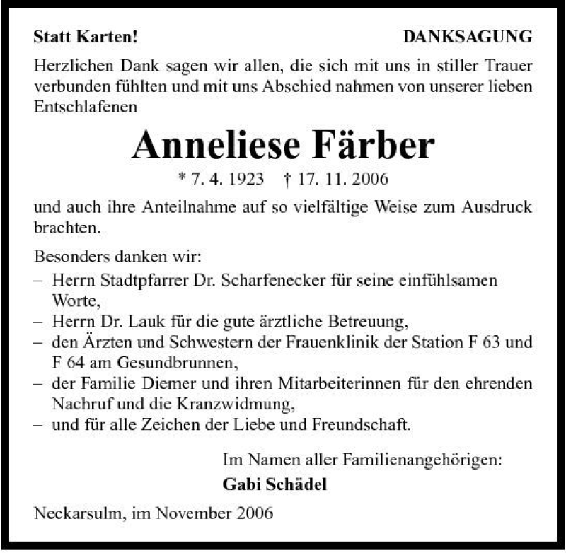 Hier finden Sie alle Traueranzeigen aus der Zeitung, die bisher für Anneliese Färber erschienen sind. Weitere Traueranzeigen, die in der Zeitung erscheinen, werden hier ebenfalls aufgelistet