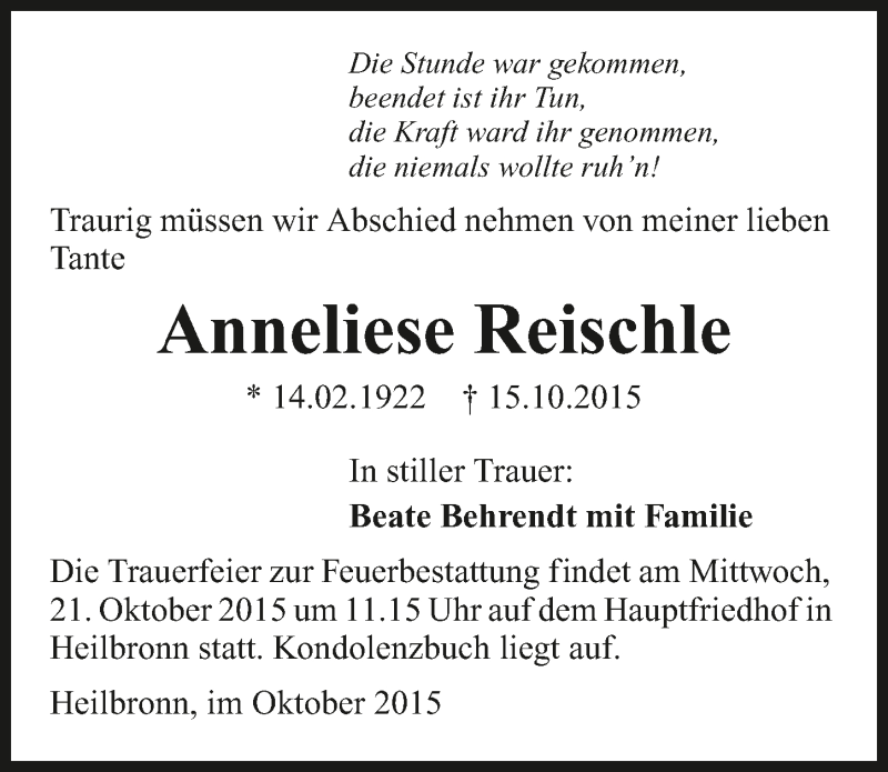 Hier finden Sie alle Traueranzeigen aus der Zeitung, die bisher für Anneliese Reischle erschienen sind. Weitere Traueranzeigen, die in der Zeitung erscheinen, werden hier ebenfalls aufgelistet