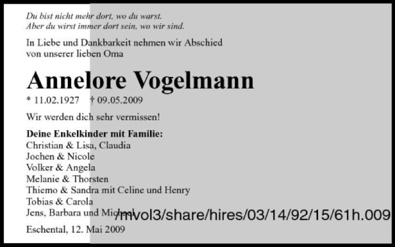 Hier finden Sie alle Traueranzeigen aus der Zeitung, die bisher für Annelore Vogelmann erschienen sind. Weitere Traueranzeigen, die in der Zeitung erscheinen, werden hier ebenfalls aufgelistet