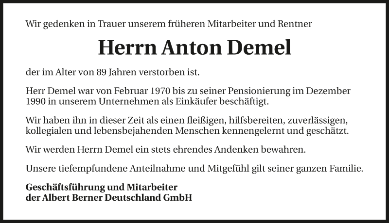 Hier finden Sie alle Traueranzeigen aus der Zeitung, die bisher für Anton Demel erschienen sind. Weitere Traueranzeigen, die in der Zeitung erscheinen, werden hier ebenfalls aufgelistet