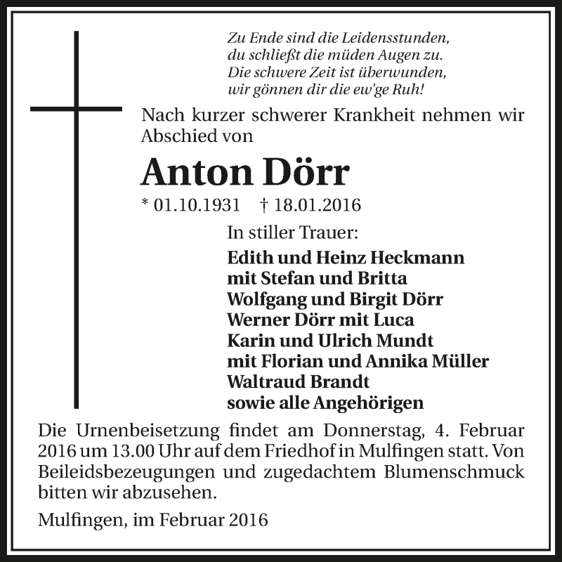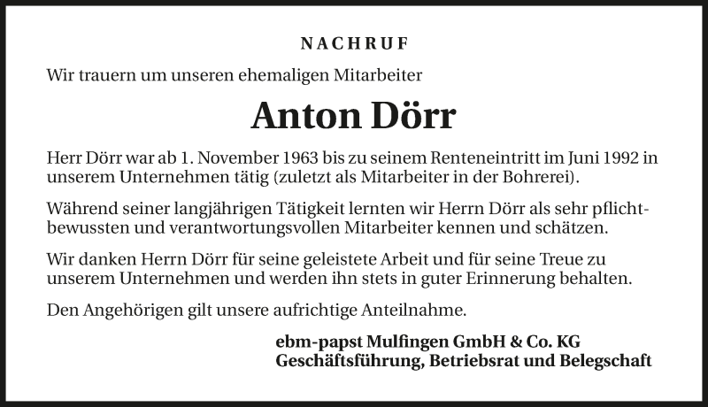 Hier finden Sie alle Traueranzeigen aus der Zeitung, die bisher für Anton Dörr erschienen sind. Weitere Traueranzeigen, die in der Zeitung erscheinen, werden hier ebenfalls aufgelistet