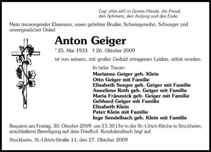 Hier finden Sie alle Traueranzeigen aus der Zeitung, die bisher für Anton Geiger erschienen sind. Weitere Traueranzeigen, die in der Zeitung erscheinen, werden hier ebenfalls aufgelistet
