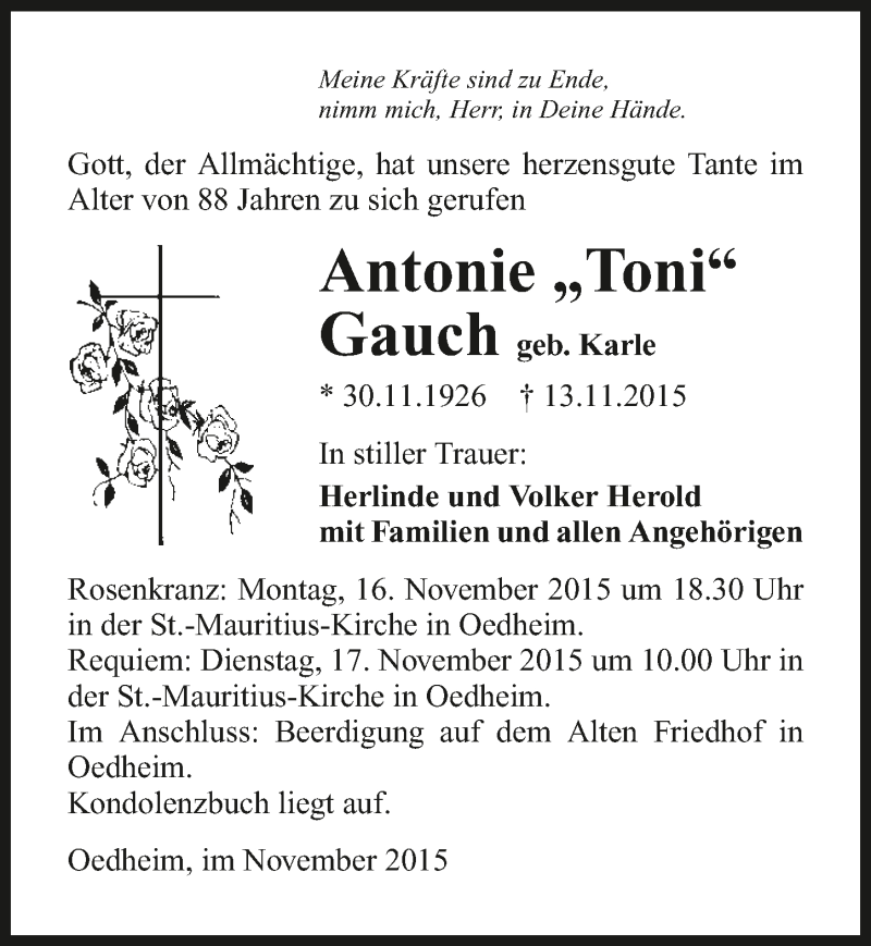 Hier finden Sie alle Traueranzeigen aus der Zeitung, die bisher für Antonie Gauch erschienen sind. Weitere Traueranzeigen, die in der Zeitung erscheinen, werden hier ebenfalls aufgelistet