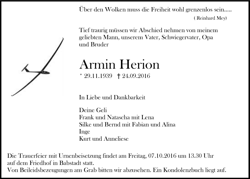 Hier finden Sie alle Traueranzeigen aus der Zeitung, die bisher für Armin Herion erschienen sind. Weitere Traueranzeigen, die in der Zeitung erscheinen, werden hier ebenfalls aufgelistet