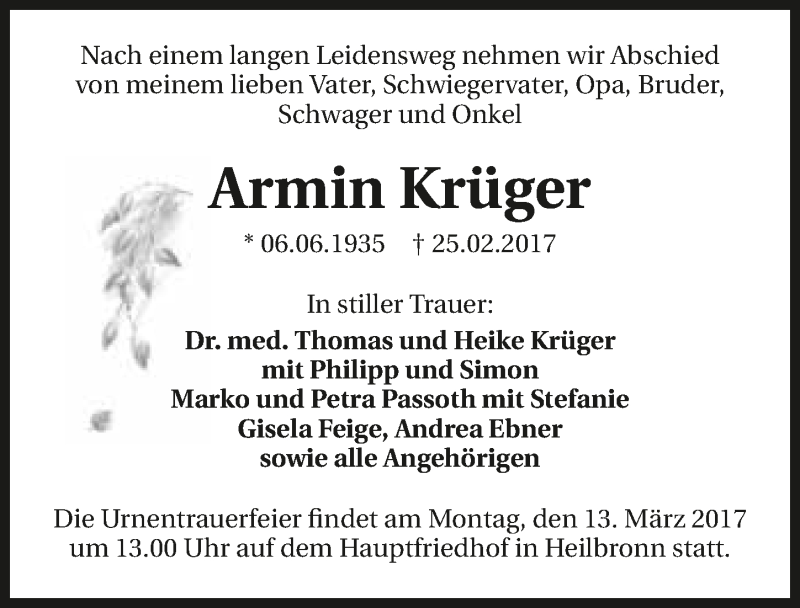 Hier finden Sie alle Traueranzeigen aus der Zeitung, die bisher für Armin Krüger erschienen sind. Weitere Traueranzeigen, die in der Zeitung erscheinen, werden hier ebenfalls aufgelistet