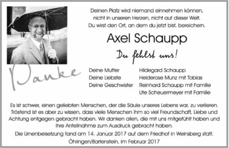 Hier finden Sie alle Traueranzeigen aus der Zeitung, die bisher für Axel Schaupp erschienen sind. Weitere Traueranzeigen, die in der Zeitung erscheinen, werden hier ebenfalls aufgelistet