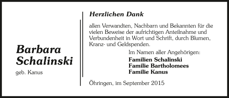 Hier finden Sie alle Traueranzeigen aus der Zeitung, die bisher für Barbara Schalinski erschienen sind. Weitere Traueranzeigen, die in der Zeitung erscheinen, werden hier ebenfalls aufgelistet