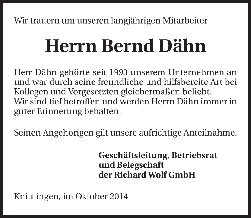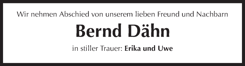 Hier finden Sie alle Traueranzeigen aus der Zeitung, die bisher für Bernd Dähn erschienen sind. Weitere Traueranzeigen, die in der Zeitung erscheinen, werden hier ebenfalls aufgelistet