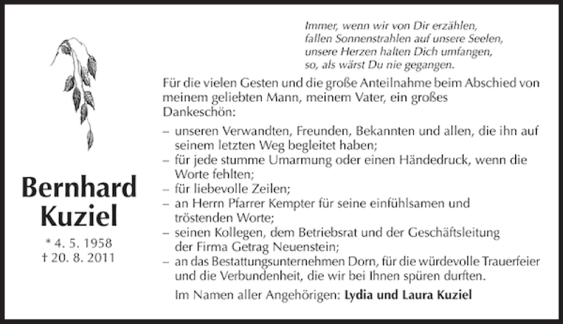 Hier finden Sie alle Traueranzeigen aus der Zeitung, die bisher für Bernhard Kuziel erschienen sind. Weitere Traueranzeigen, die in der Zeitung erscheinen, werden hier ebenfalls aufgelistet