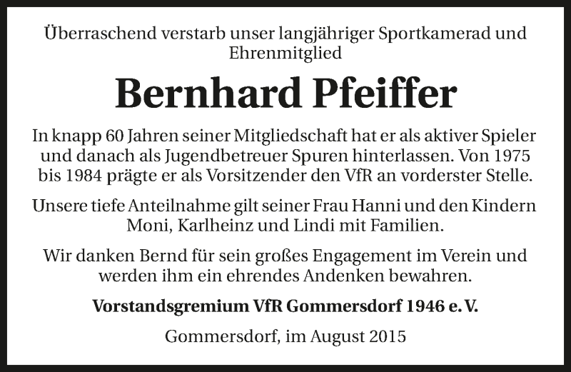 Hier finden Sie alle Traueranzeigen aus der Zeitung, die bisher für Bernhard Pfeiffer erschienen sind. Weitere Traueranzeigen, die in der Zeitung erscheinen, werden hier ebenfalls aufgelistet