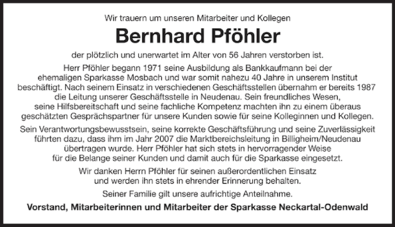 Hier finden Sie alle Traueranzeigen aus der Zeitung, die bisher für Bernhard Pföhler erschienen sind. Weitere Traueranzeigen, die in der Zeitung erscheinen, werden hier ebenfalls aufgelistet