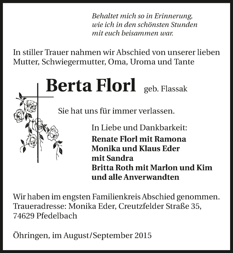 Hier finden Sie alle Traueranzeigen aus der Zeitung, die bisher für Berta Florl erschienen sind. Weitere Traueranzeigen, die in der Zeitung erscheinen, werden hier ebenfalls aufgelistet