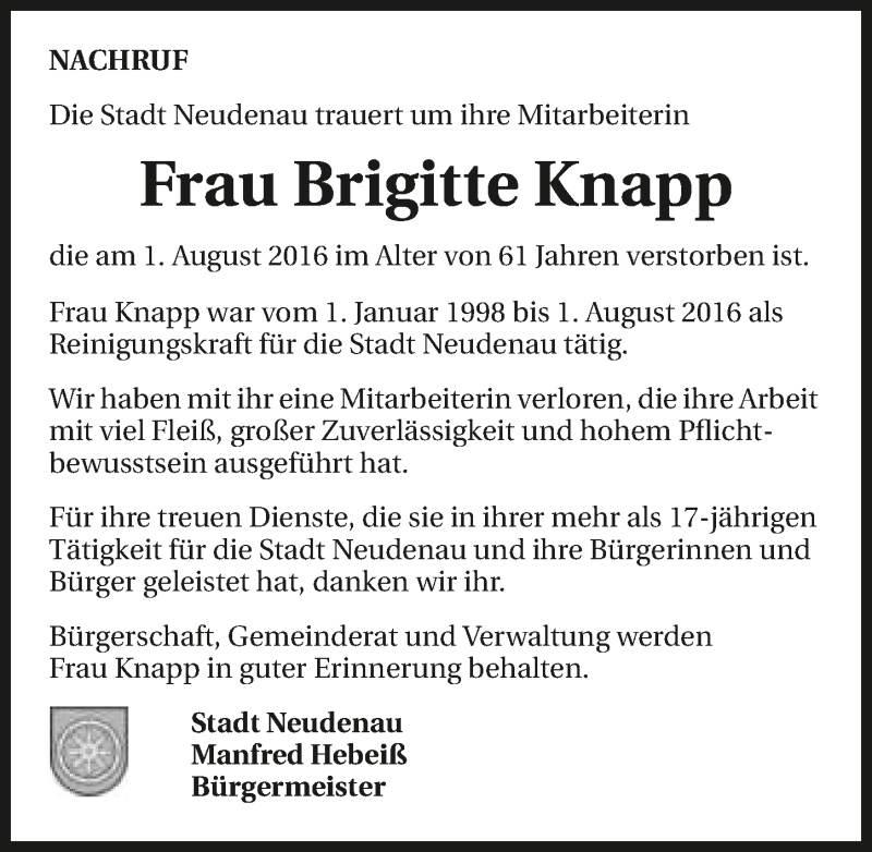 Hier finden Sie alle Traueranzeigen aus der Zeitung, die bisher für Brigitte Knapp erschienen sind. Weitere Traueranzeigen, die in der Zeitung erscheinen, werden hier ebenfalls aufgelistet