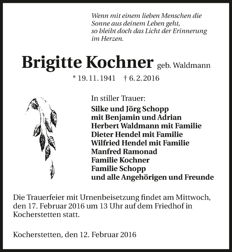 Hier finden Sie alle Traueranzeigen aus der Zeitung, die bisher für Brigitte Kochner erschienen sind. Weitere Traueranzeigen, die in der Zeitung erscheinen, werden hier ebenfalls aufgelistet