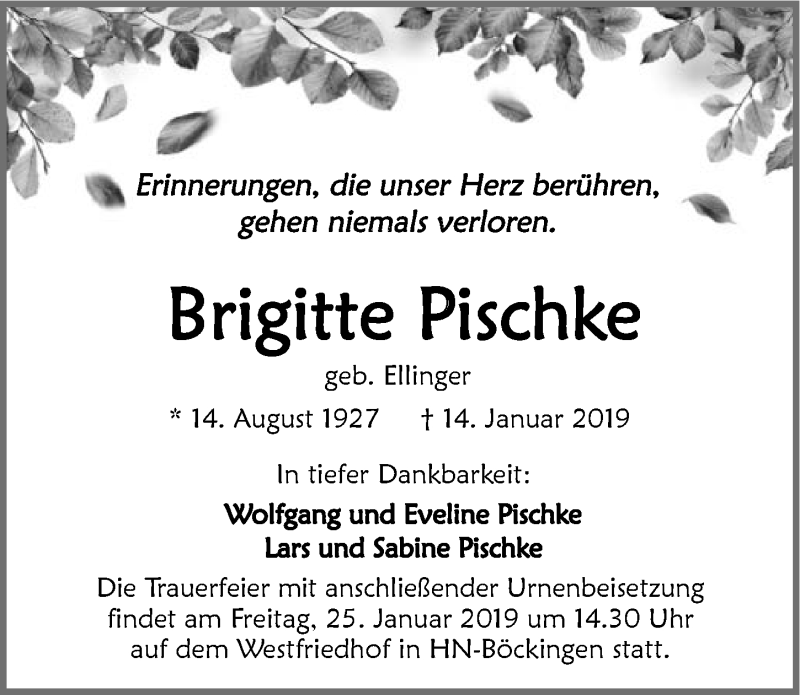 Hier finden Sie alle Traueranzeigen aus der Zeitung, die bisher für Brigitte Pischke erschienen sind. Weitere Traueranzeigen, die in der Zeitung erscheinen, werden hier ebenfalls aufgelistet