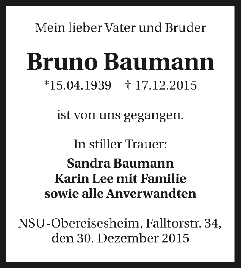 Hier finden Sie alle Traueranzeigen aus der Zeitung, die bisher für Bruno Baumann erschienen sind. Weitere Traueranzeigen, die in der Zeitung erscheinen, werden hier ebenfalls aufgelistet
