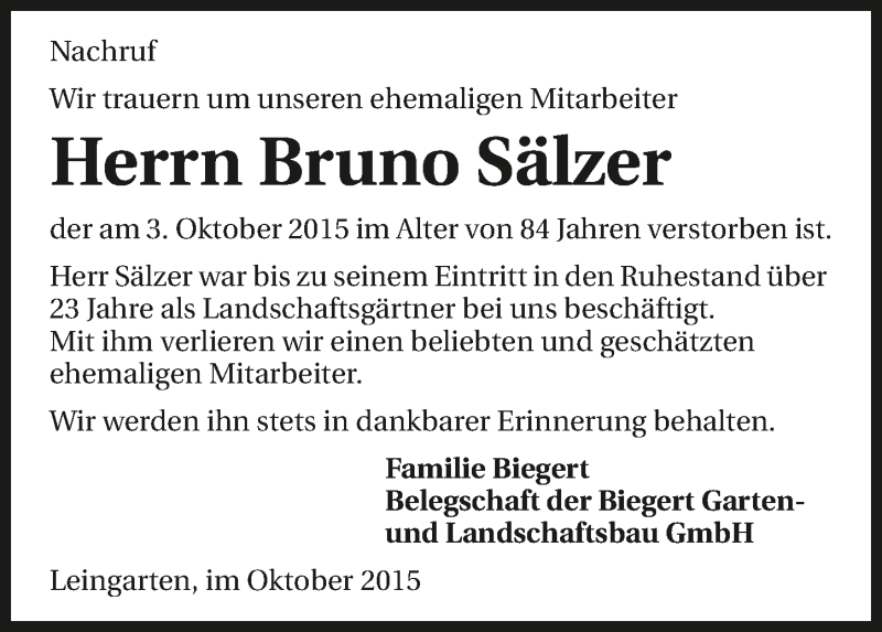 Hier finden Sie alle Traueranzeigen aus der Zeitung, die bisher für Bruno Sälzer erschienen sind. Weitere Traueranzeigen, die in der Zeitung erscheinen, werden hier ebenfalls aufgelistet