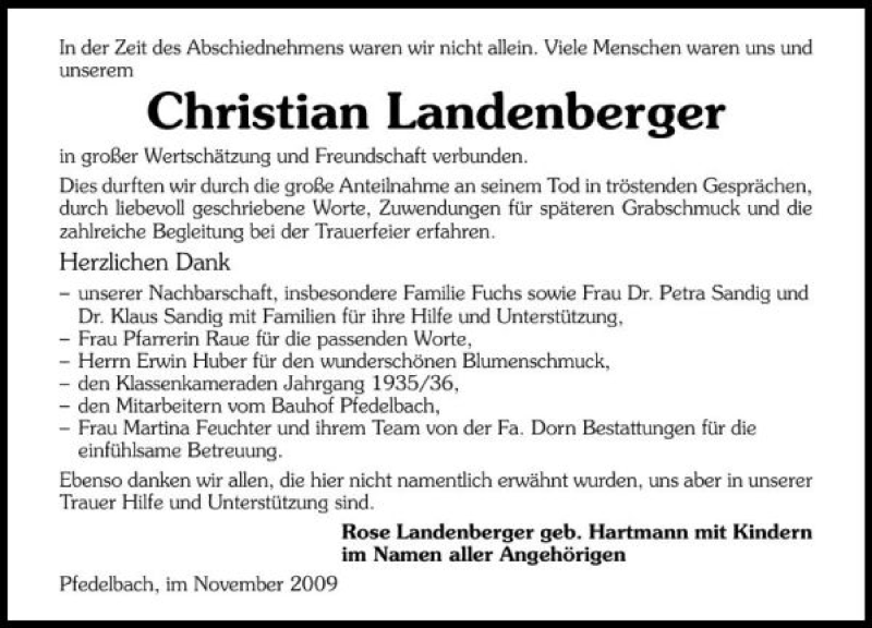 Hier finden Sie alle Traueranzeigen aus der Zeitung, die bisher für Christain Landenberger erschienen sind. Weitere Traueranzeigen, die in der Zeitung erscheinen, werden hier ebenfalls aufgelistet