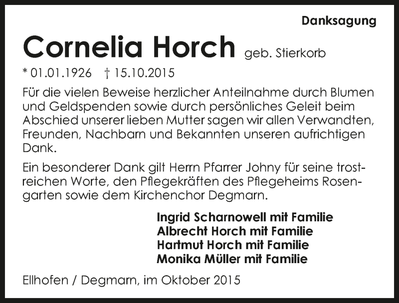 Hier finden Sie alle Traueranzeigen aus der Zeitung, die bisher für Cornelia Horch erschienen sind. Weitere Traueranzeigen, die in der Zeitung erscheinen, werden hier ebenfalls aufgelistet