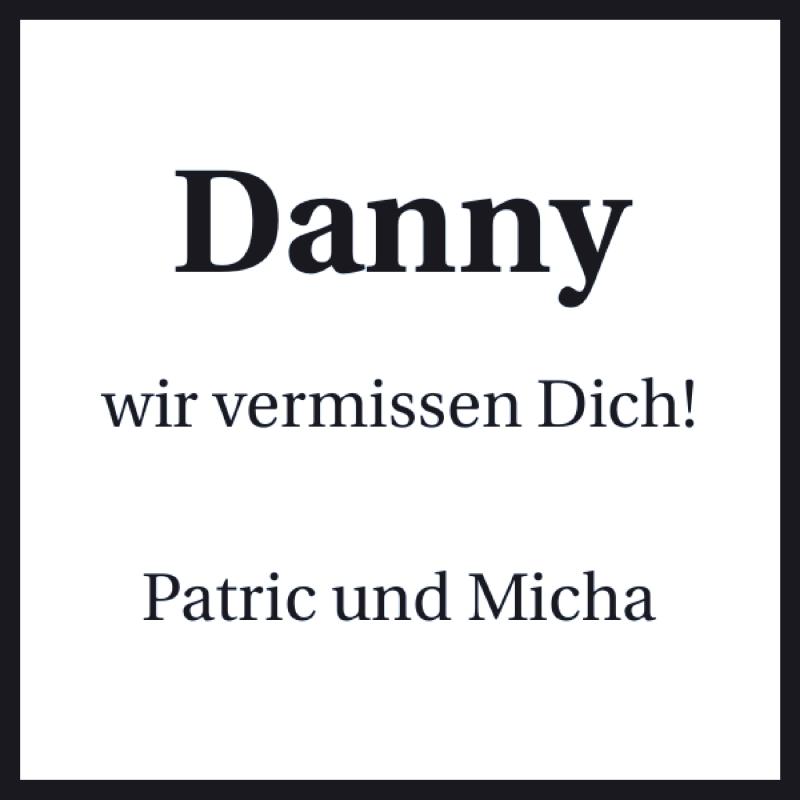 Hier finden Sie alle Traueranzeigen aus der Zeitung, die bisher für Danny Danny erschienen sind. Weitere Traueranzeigen, die in der Zeitung erscheinen, werden hier ebenfalls aufgelistet