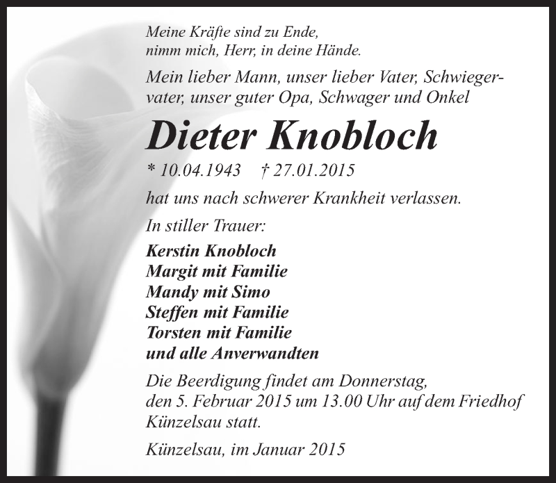 Hier finden Sie alle Traueranzeigen aus der Zeitung, die bisher für Dieter Knobloch erschienen sind. Weitere Traueranzeigen, die in der Zeitung erscheinen, werden hier ebenfalls aufgelistet