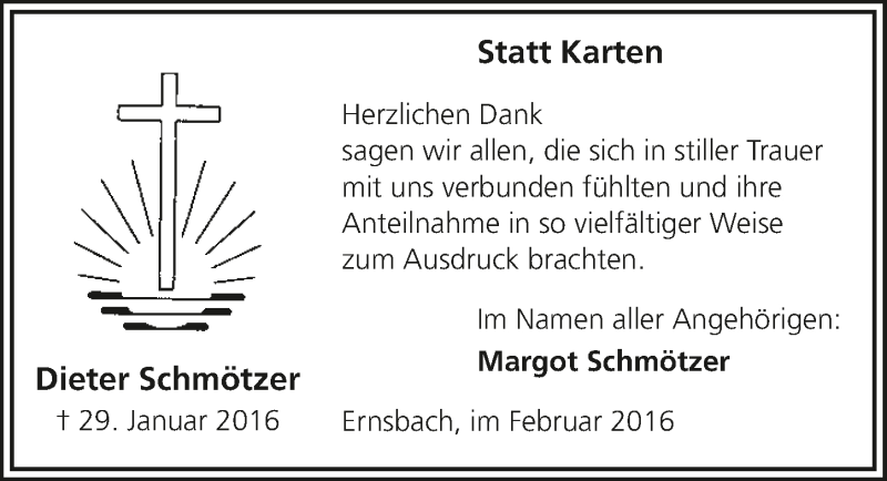 Hier finden Sie alle Traueranzeigen aus der Zeitung, die bisher für Dieter Schmötzer erschienen sind. Weitere Traueranzeigen, die in der Zeitung erscheinen, werden hier ebenfalls aufgelistet