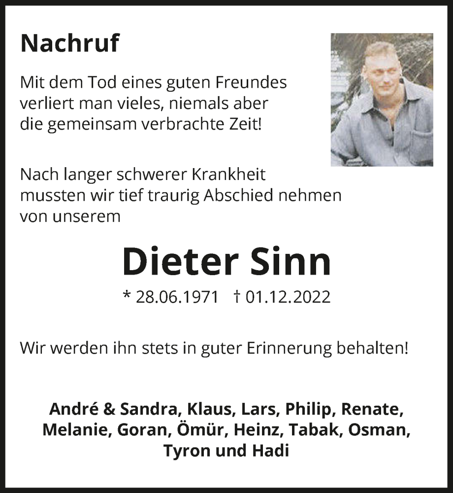Hier finden Sie alle Traueranzeigen aus der Zeitung, die bisher für Dieter Sinn erschienen sind. Weitere Traueranzeigen, die in der Zeitung erscheinen, werden hier ebenfalls aufgelistet