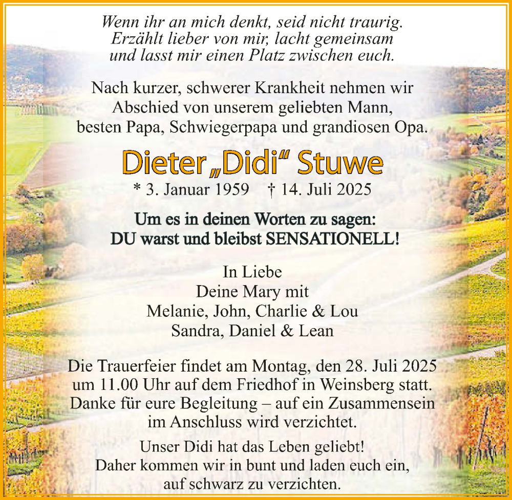 Hier finden Sie alle Traueranzeigen aus der Zeitung, die bisher für Dieter Stuwe erschienen sind. Weitere Traueranzeigen, die in der Zeitung erscheinen, werden hier ebenfalls aufgelistet