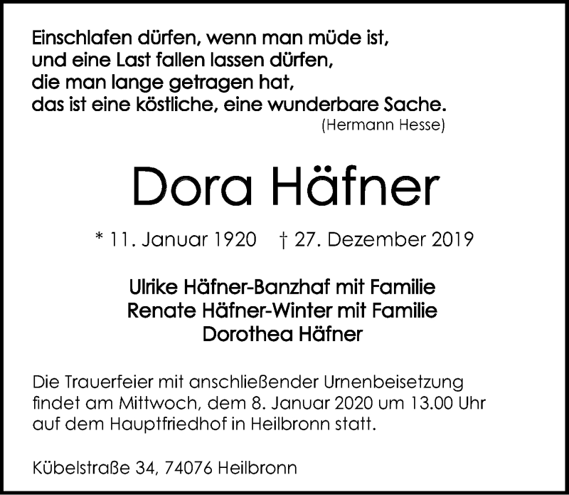 Hier finden Sie alle Traueranzeigen aus der Zeitung, die bisher für Dora Häfner erschienen sind. Weitere Traueranzeigen, die in der Zeitung erscheinen, werden hier ebenfalls aufgelistet