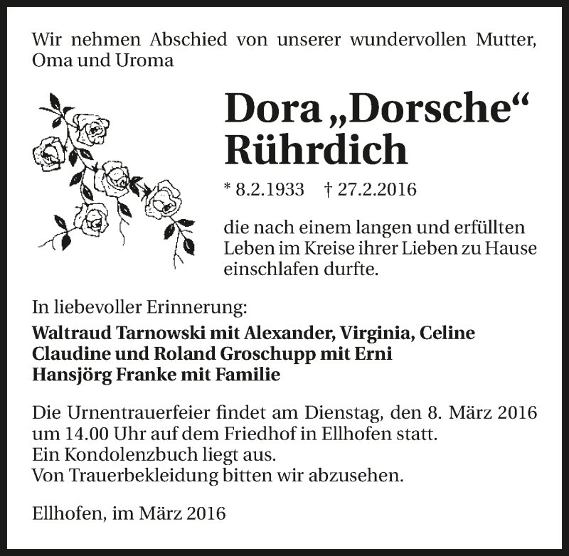 Hier finden Sie alle Traueranzeigen aus der Zeitung, die bisher für Dora Rührdich erschienen sind. Weitere Traueranzeigen, die in der Zeitung erscheinen, werden hier ebenfalls aufgelistet
