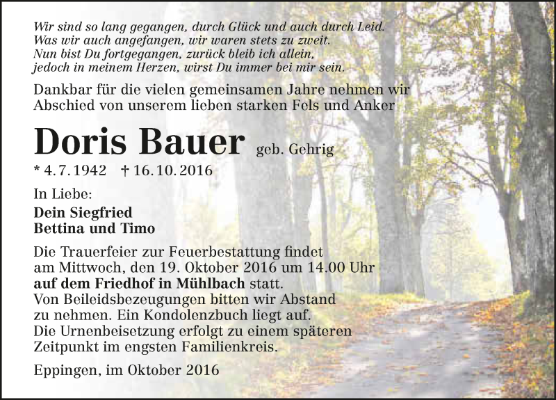 Hier finden Sie alle Traueranzeigen aus der Zeitung, die bisher für Doris Bauer erschienen sind. Weitere Traueranzeigen, die in der Zeitung erscheinen, werden hier ebenfalls aufgelistet